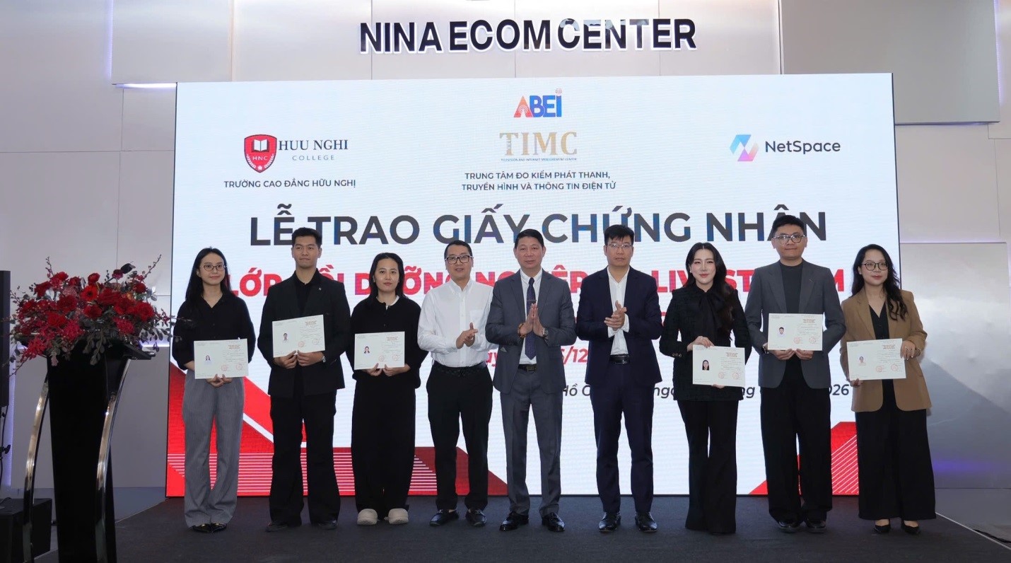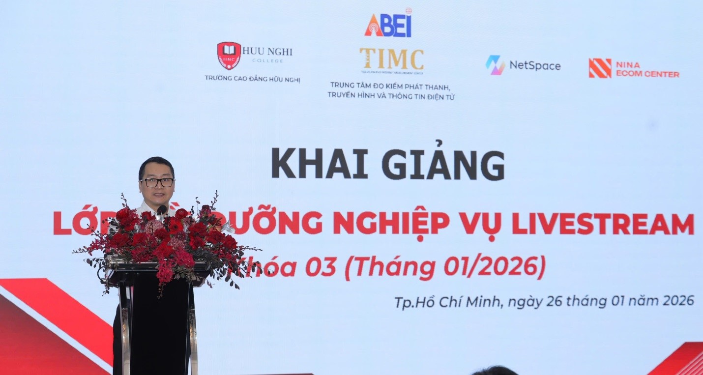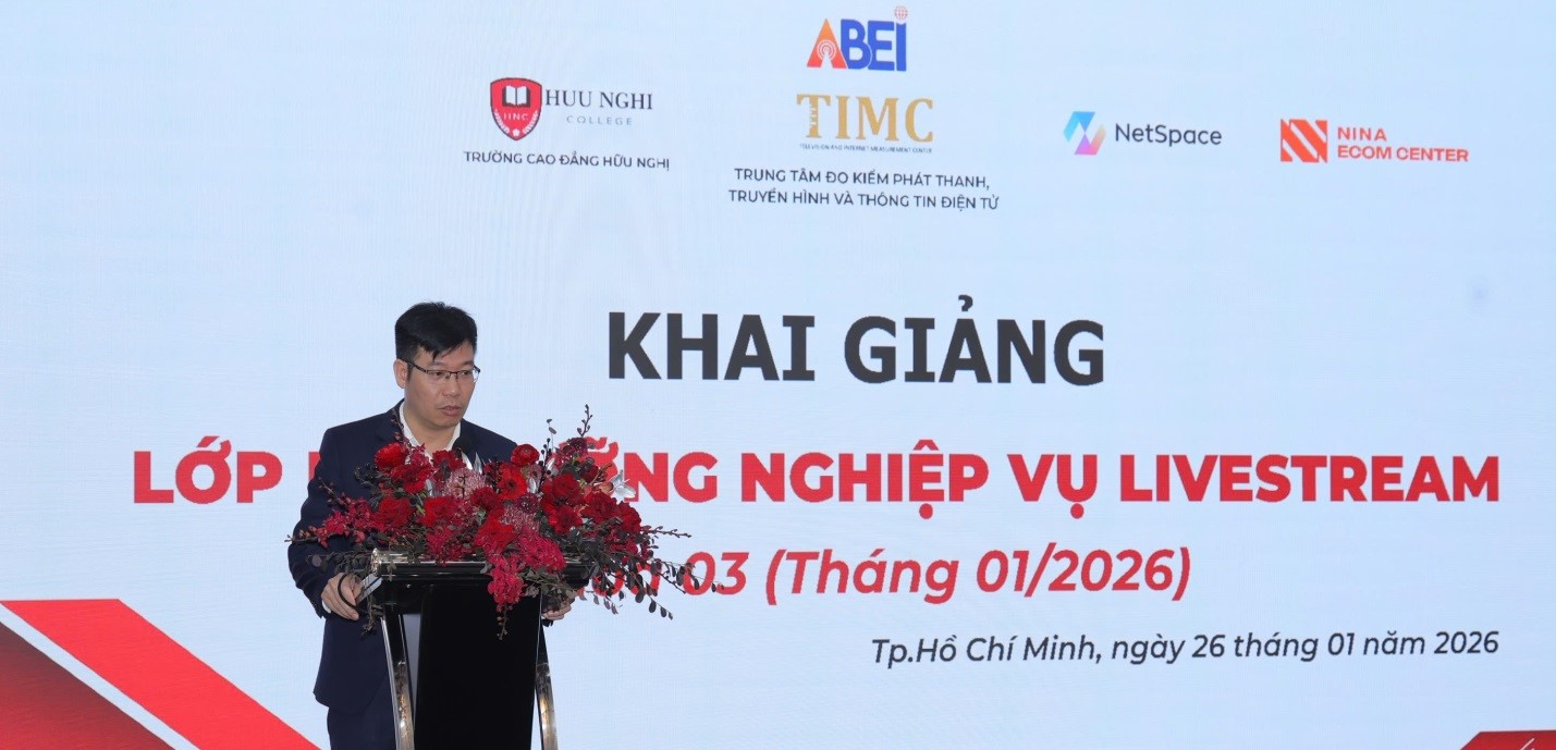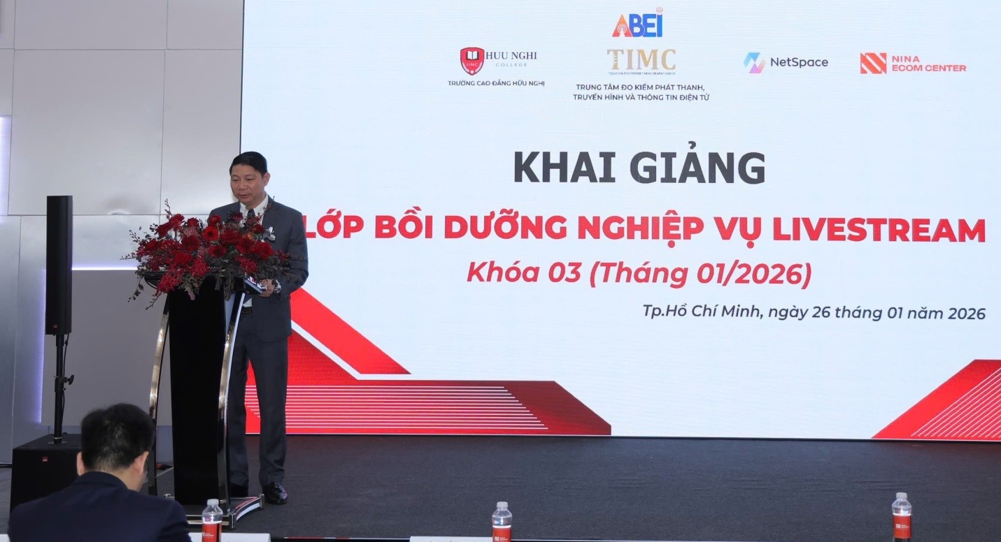 Ngày 26/01/2026, tại TP. Hồ Chí Minh, Trung tâm Đo kiểm Phát thanh, Truyền hình và Thông tin điện tử (Trung tâm) đã phối hợp với Trường Cao đẳng Hữu Nghị, Công ty Cổ phần Công nghệ Truyền thông Không gian số (Netspace) và Công ty TNHH Thương mại Dịch vụ Nina Ecom Center tổ chức Lễ khai giảng Lớp bồi dưỡng nghiệp vụ Livestream Khóa 3 (tháng 01/2026).