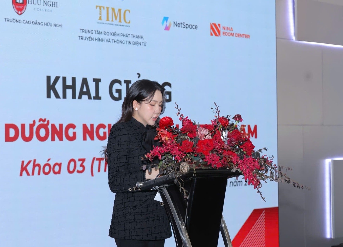 Tham dự buổi lễ có Ông Nguyễn Chấn – Phó Cục trưởng Cục Phát thanh, Truyền hình và Thông tin điện tử (PTTH&TTĐT); Ông Nguyễn Thanh Hải – Giám đốc Trung tâm Đo kiểm Phát thanh, Truyền hình và Thông tin điện tử; Ông Lê Hoàng Sơn – Phó hiệu trưởng trường Cao đẳng Hữu Nghị; đại diện NetSpace, Nina Ecom Center - các đơn vị phối hợp tổ chức, cùng đông đảo giảng viên và học viên tham gia khóa học.
